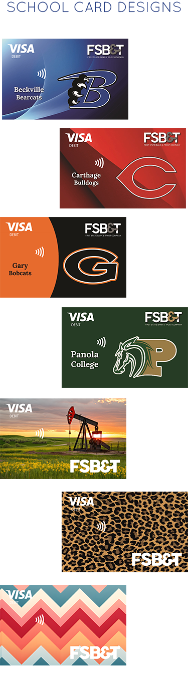 Individuals with a consumer checking account at First State Bank can show support for a favorite school by selecting one of four school card designs, or customize the card by using a personal image as a card design.